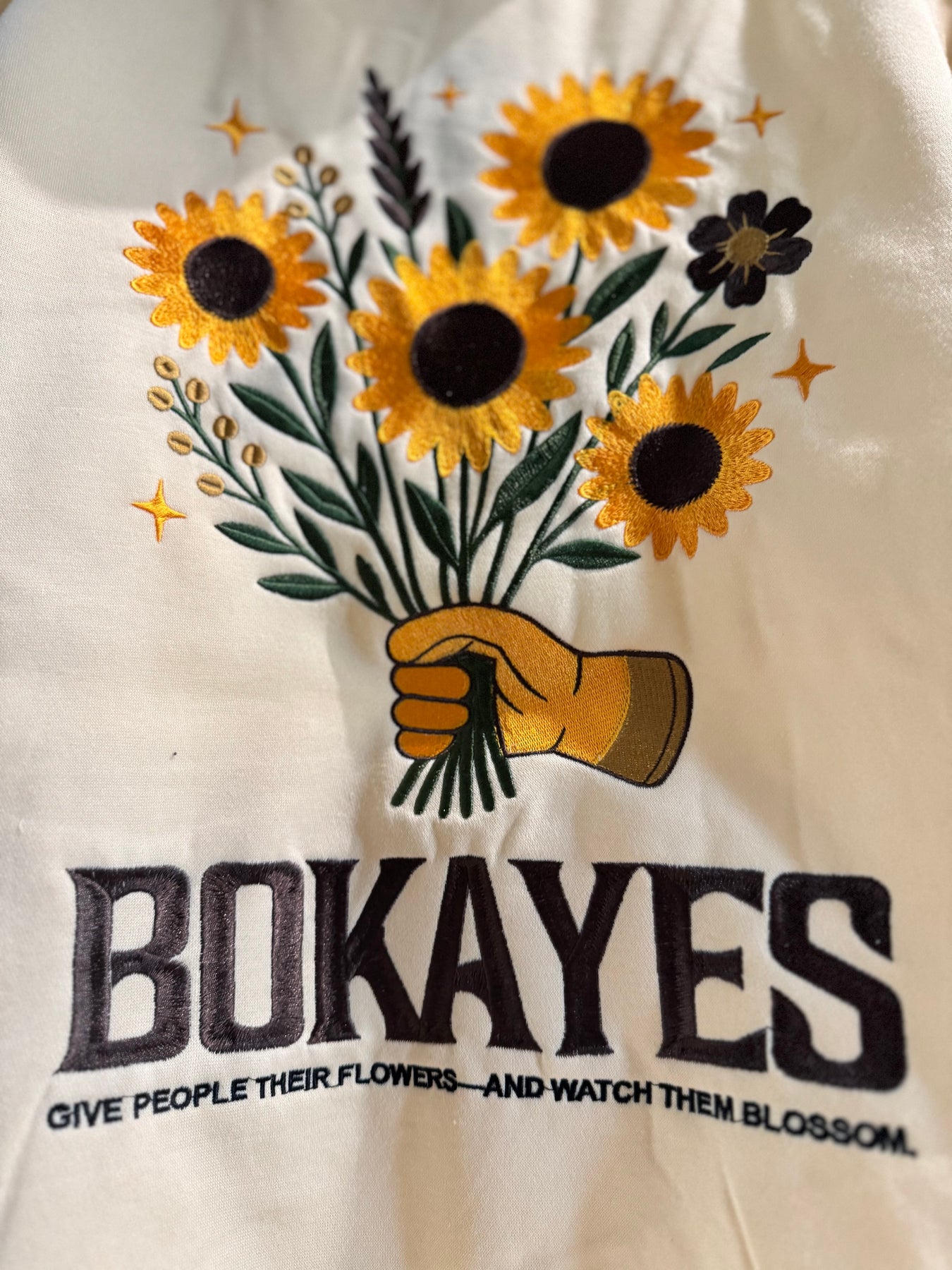 The back tells the full story: a gloved hand holding a handful of sunflowers, surrounded by rich embroidery and the words “BOKAYES” across the bottom in bold brown thread. Just beneath, the reminder that grounds it all:
